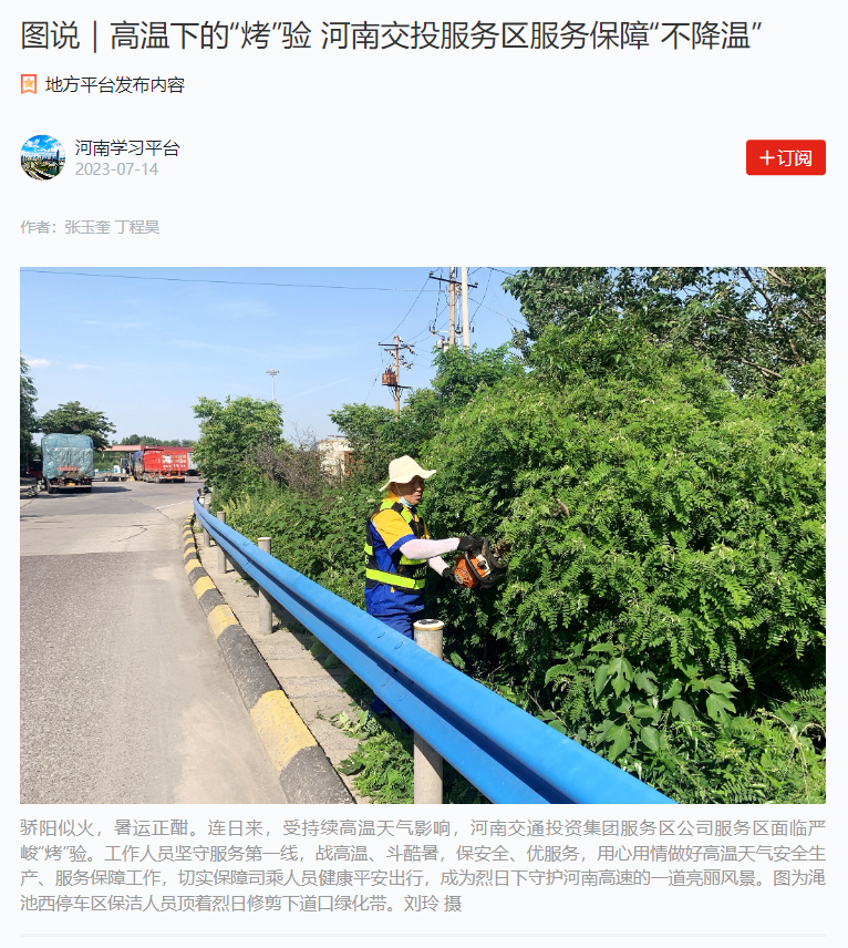 來源: 本站 發布時間: 2023-07-147月14日,“學習強國河南學習平臺” 以“高溫下的’烤’驗 河南交投服務區服務保障‘不降溫‘”為題,對公司所屬服務區、加油站做好高溫天氣安全生產、服務保障工作進行了宣傳報道。